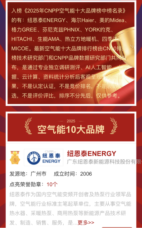 空氣能采暖品牌怎么選?究竟哪款產(chǎn)品更符合家庭需求?近日,十大品牌網(wǎng)(CNPP)通過專業(yè)獨(dú)立調(diào)研測(cè)評(píng)、AI人工智能、大數(shù)據(jù)等綜合分析后,發(fā)布了《2025年CNPP空氣能十大品牌榜中榜名錄》,上榜的有紐恩泰、海爾、美的、格力等品牌,為消費(fèi)者的雙11選購提供了參考。本文將深度分析榜單中十大品牌的核心優(yōu)勢(shì),并推薦合適的產(chǎn)品,為您的冬季采暖提供清晰的解決方案。