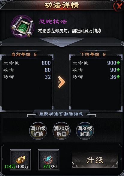 在玩家獲取功法后會(huì)發(fā)現(xiàn),不對(duì)呀,怎么這功法到我手上就差了那么一截???其實(shí)功法有著等級(jí),就像我們不可能剛掌握一項(xiàng)技能就可以用的出神入化,我們還需提升功法等級(jí),在提升的途中不僅可以提升屬性,每十級(jí)還會(huì)解鎖該功法的招式,提升至滿級(jí)后便會(huì)與俠客手中的功法別無二致。