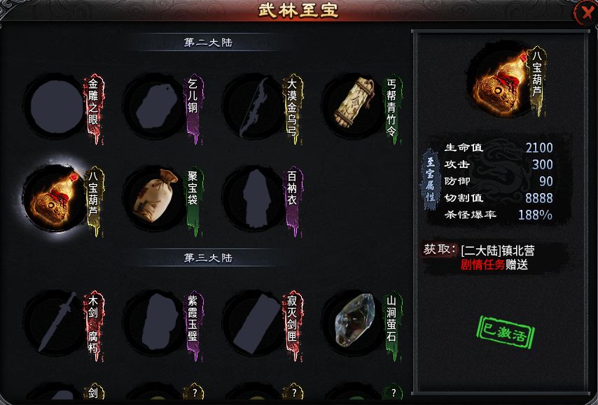 而藏在進(jìn)程中的“武林至寶”,滿足收集與進(jìn)階。這里每一樣至寶都是武俠界的大夢(mèng)想。在使用后,玩家將獲取大量屬性加成,在某個(gè)大陸遇到了難啃的骨頭可以嘗試先去尋尋該大陸有特殊效果的武林至寶,沒準(zhǔn)有奇效。