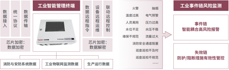 依托事件鏈模型梳理的風(fēng)險(xiǎn)要素及管理手段,部署天澤自研的工業(yè)智能管理終端,對(duì)消防物聯(lián)網(wǎng)監(jiān)測(cè)設(shè)備、工業(yè)物聯(lián)網(wǎng)設(shè)備、生產(chǎn)運(yùn)行設(shè)備、視頻AI監(jiān)控、安全工作執(zhí)行規(guī)范等多類關(guān)鍵數(shù)據(jù)進(jìn)行采集整合、分析與處理,形成事件鏈智能監(jiān)管系統(tǒng),通過(guò)對(duì)設(shè)備/節(jié)點(diǎn)的管理,加強(qiáng)對(duì)高風(fēng)險(xiǎn)事件的防護(hù)與阻斷措施管理。