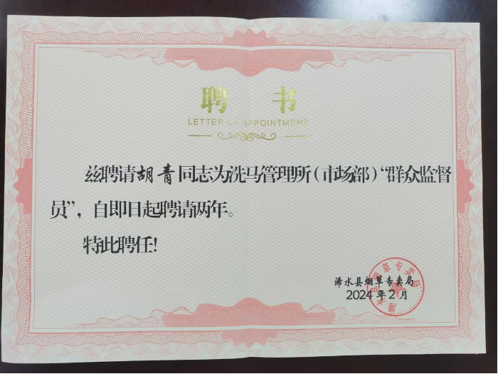 (浠水縣煙草專賣局為零售客戶下達(dá)群眾監(jiān)督聘書)