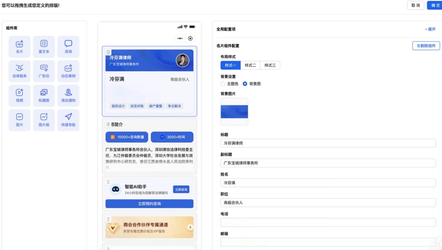 AI律師智能體致力于為律師打造個(gè)性化專業(yè)工作臺(tái),助力提升工作效能與品牌影響力。律師可根據(jù)自身業(yè)務(wù)領(lǐng)域和服務(wù)習(xí)慣,靈活配置工作界面布局與互動(dòng)方式,結(jié)合AI助手、內(nèi)容管理與智能營(yíng)銷工具,全面提升法律服務(wù)的響應(yīng)速度、專業(yè)表現(xiàn)與客戶觸達(dá)能力,通過(guò)構(gòu)建專屬的數(shù)字法律助手,塑造具有影響力的個(gè)人專業(yè)品牌。