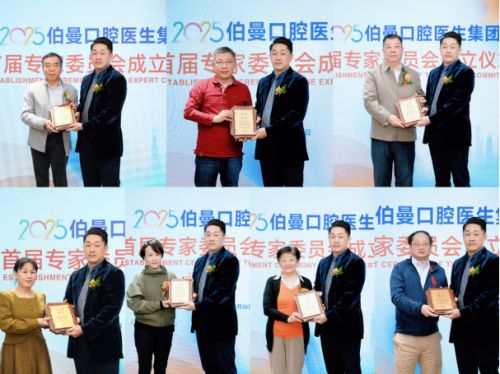 授牌后,徐總與專家們逐一在臺上合影,鏡頭定格下這一匯聚行業(yè)智慧的歷史性瞬間——專家們沉穩(wěn)睿智的笑容與伯曼口腔的品牌標識交相輝映,彰顯出“醫(yī)研協(xié)同、智領(lǐng)未來”的戰(zhàn)略格局。