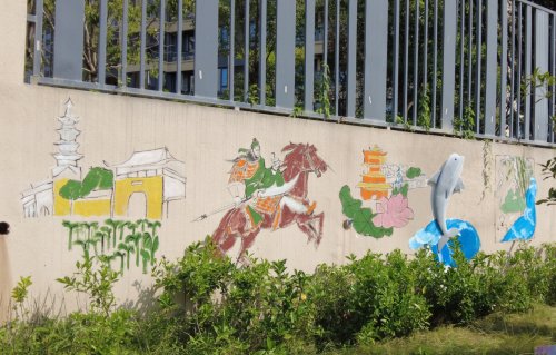 在創(chuàng)意老師、社區(qū)工作人員和洪山區(qū)局志愿者的帶領(lǐng)下,孩子們將調(diào)研中發(fā)現(xiàn)的“問題墻面”作為創(chuàng)作畫布,以彩繪與藝術(shù)裝置賦予其新生:裂縫變成游魚,墻面“長”出3D打印的江豚;黃鶴樓、長江大橋等地標躍然其上,卓刀泉傳說、洪山菜薹、楚香制作等非遺元素也巧妙融入。原本破損的角落,蛻變?yōu)槿诤系赜蛭幕c溫暖情感的公共藝術(shù)空間。