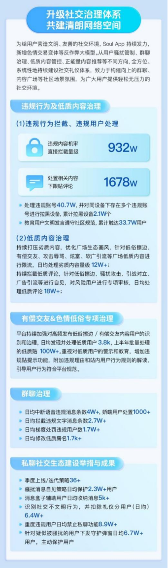 在社交內(nèi)容治理方面,Soul通過多維度策略持續(xù)優(yōu)化平臺環(huán)境。平臺新增了可識別色情交易變體等違規(guī)行為的反作弊大模型,進(jìn)一步提升了對新型違規(guī)行為的發(fā)現(xiàn)能力。數(shù)據(jù)顯示,平臺通過AI技術(shù)實(shí)現(xiàn)違規(guī)內(nèi)容機(jī)審攔截量級達(dá)932萬,累計(jì)拉黑同設(shè)備下存在的多個(gè)違規(guī)賬號2.1萬個(gè)。針對群聊場景的特殊性,平臺實(shí)施了精細(xì)化管控措施。日均中斷語音違規(guī)消息4萬余條,攔截違規(guī)文字消息2.7萬余條,并對違規(guī)用戶實(shí)施梯度處罰,日均處理量達(dá)1.7萬+人次。在私聊場景中,平臺通過騷擾消息自見策略日均保護(hù)2.3萬+用戶,消息盒子功能輔助用戶日均收納消息超5000條。