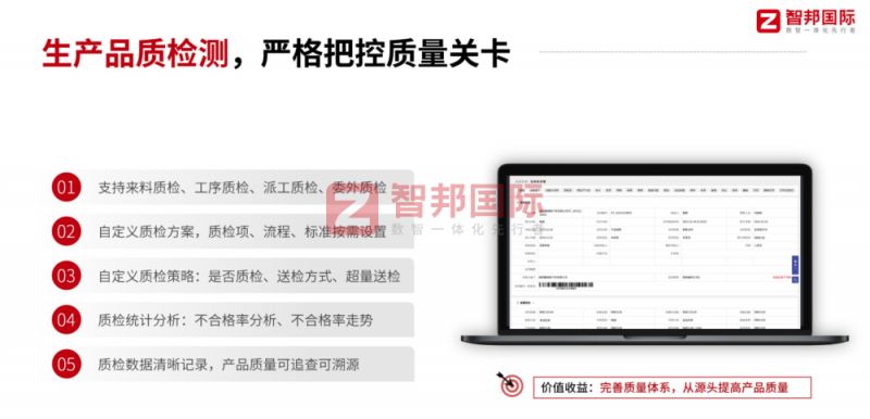 智邦一體化ERP創(chuàng)新推出實(shí)時(shí)質(zhì)量檢測(cè)與反饋機(jī)制,將質(zhì)量檢測(cè)融入到生產(chǎn)的每一個(gè)環(huán)節(jié),實(shí)現(xiàn)了從“事后檢測(cè)”向“事中控制”的轉(zhuǎn)變。在生產(chǎn)過(guò)程中,系統(tǒng)會(huì)實(shí)時(shí)采集各個(gè)關(guān)鍵質(zhì)量控制點(diǎn)的檢測(cè)數(shù)據(jù),包括原材料的進(jìn)貨檢驗(yàn)、生產(chǎn)過(guò)程中的工序檢驗(yàn)以及成品檢驗(yàn)等。