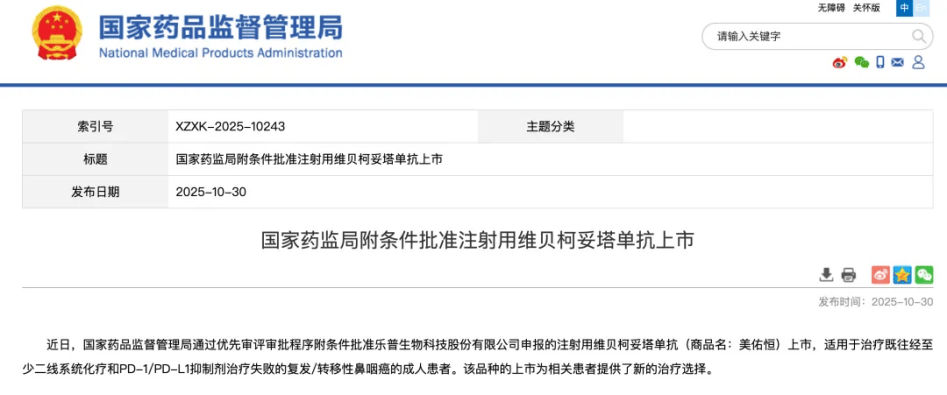 10月30日,國家藥品監(jiān)督管理局(NMPA)官網顯示,樂普生物申報的的注射用維貝柯妥塔單抗(MRG003)獲批上市,用于治療既往經至少二線系統(tǒng)化療和PD-1/PD-L1抑制劑治療失敗的復發(fā)或轉移性鼻咽癌(NPC)患者。