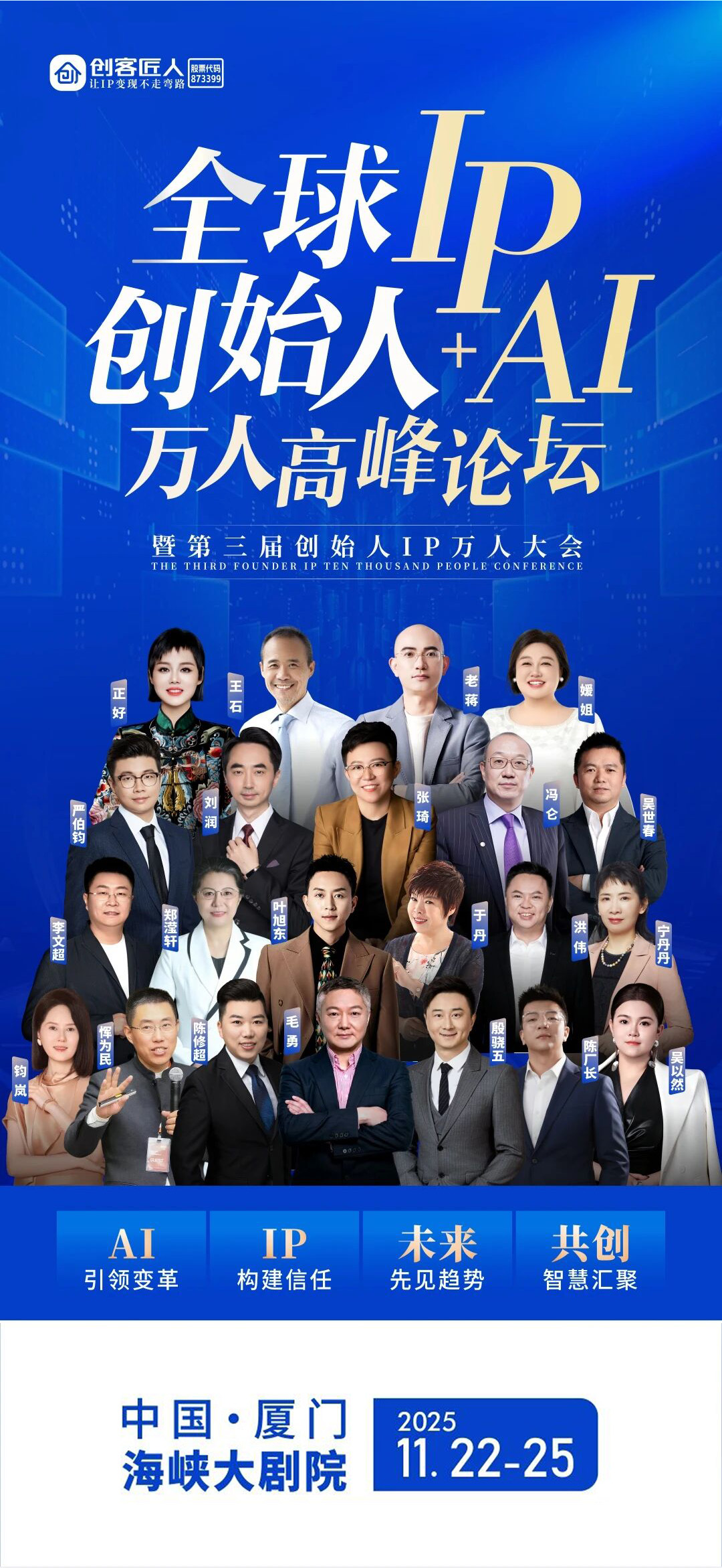 在此背景下,“2025全球創(chuàng)始人IP+AI萬人高峰論壇(暨第三屆創(chuàng)始人IP萬人大會)” 應運而生。大會將于2025年11月22日至25日在廈門海峽大劇院隆重舉行,旨在匯聚創(chuàng)始人、AI專家與IP操盤手,共同探討如何在AI重塑生產力的時代,以IP重構品牌價值,以聯(lián)盟經(jīng)濟打破競爭壁壘。