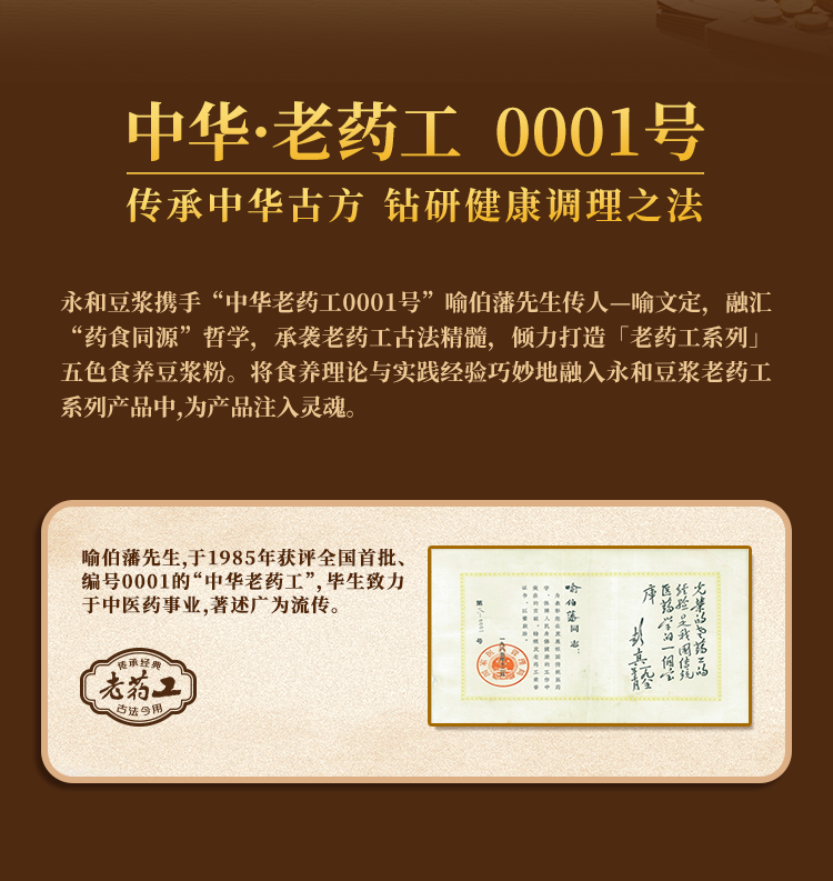 一輩子只做一件事——這句話概括了“中華老藥工0001號”喻伯藩先生的一生。正如永和豆?jié){40余年堅持以一顆大豆為核心,傳承與發(fā)揚中華傳統(tǒng)飲食文化。在不同的領域,雙方有著同樣的赤誠與執(zhí)著。