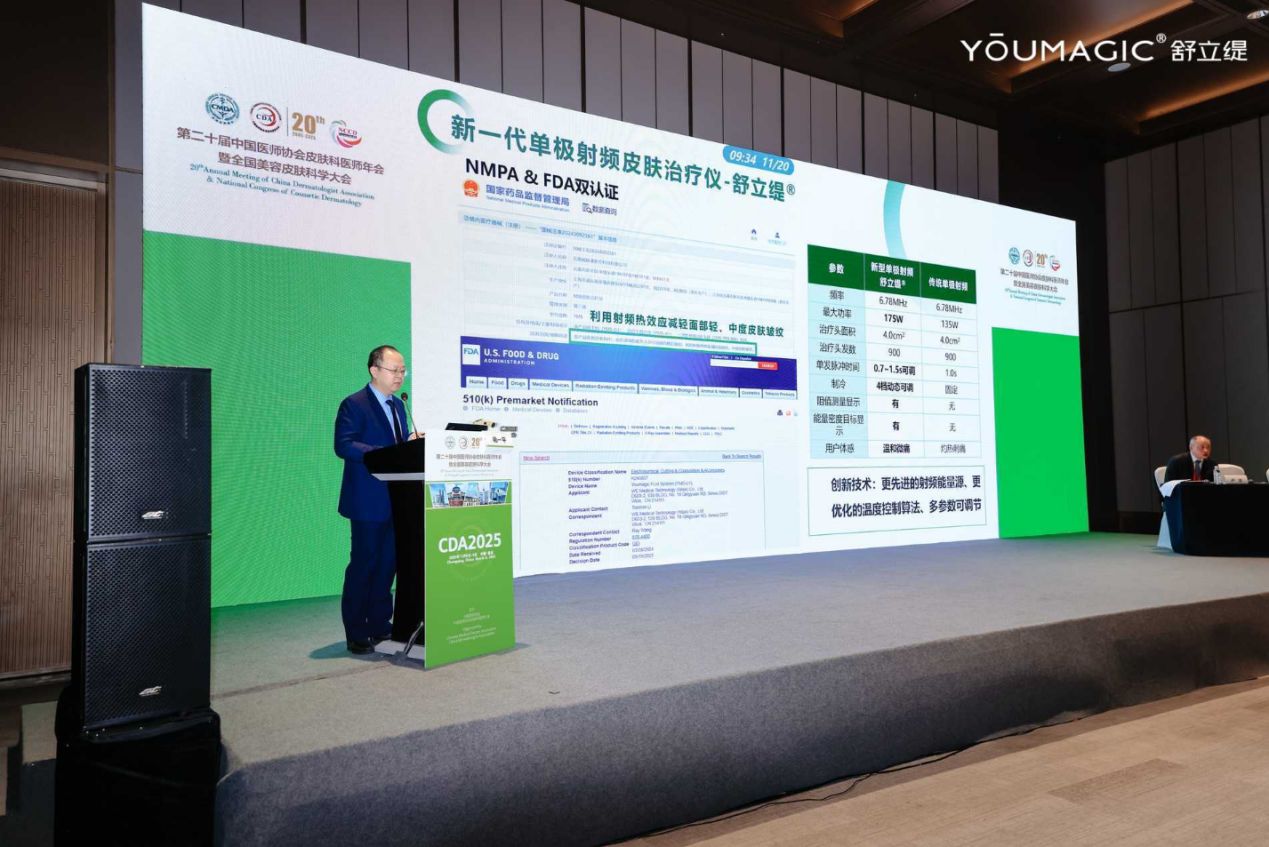 11月6-9日,第二十屆中國醫(yī)師協(xié)會皮膚科醫(yī)師年會暨全國美容皮膚科學大會(CDA2025)在重慶盛大召開,作為國內(nèi)皮膚科領域的頂級學術盛會,吸引了眾多醫(yī)學專家、科研學者及從業(yè)者齊聚。YOUMAGIC舒立緹亮相大會,通過科技感拉滿的展位全方位展現(xiàn)“清華基因+醫(yī)研融合”的技術創(chuàng)新實力,更以“新一代單極射頻抗衰創(chuàng)新峰會”與四場技術創(chuàng)新小課堂雙線發(fā)力,展示專業(yè)底蘊與技術深度,贏得行業(yè)廣泛關注。