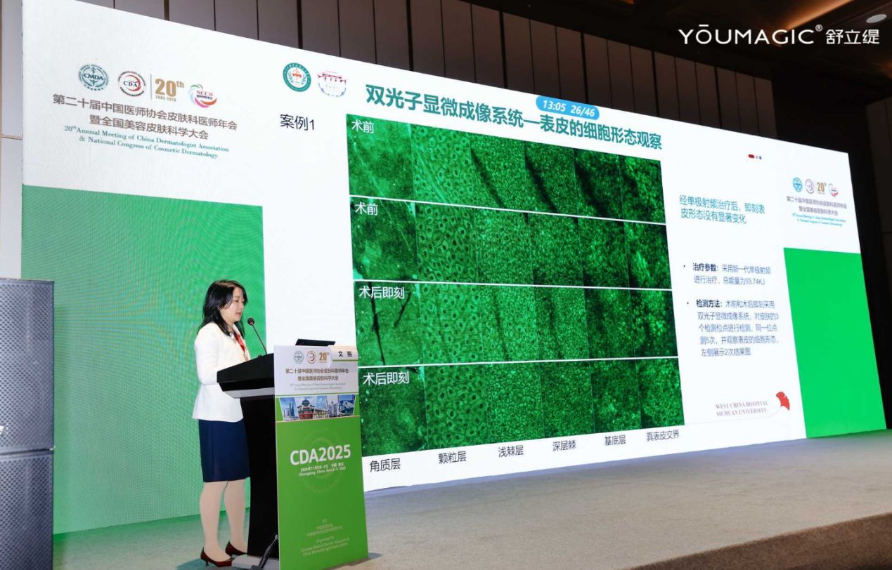 四川大學華西醫(yī)院皮膚科副主任文翔則聚焦療效評估體系革新,提出“客觀檢測+主觀評價”的科學范式。并分享了團隊的研究成果,表示舒立緹治療后,下頜提拉效果明顯,皮膚彈性顯著增加;治療1個月皮膚厚度提升約0.03厘米,且皮下脂肪層無明顯容積損失;且雙光子等檢測證實表皮、真皮層結構無異常,為產(chǎn)品安全性與有效性提供了多維度實證,也為行業(yè)提供了可復制的評估標準。