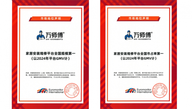 據(jù)悉,今年3月,歐睿國際發(fā)布行業(yè)市場地位聲明稱“萬師傅系家居安裝維修平臺全國規(guī)模及市占率雙第一(以2024平臺GMV計)”,穩(wěn)坐行業(yè)龍頭寶座。