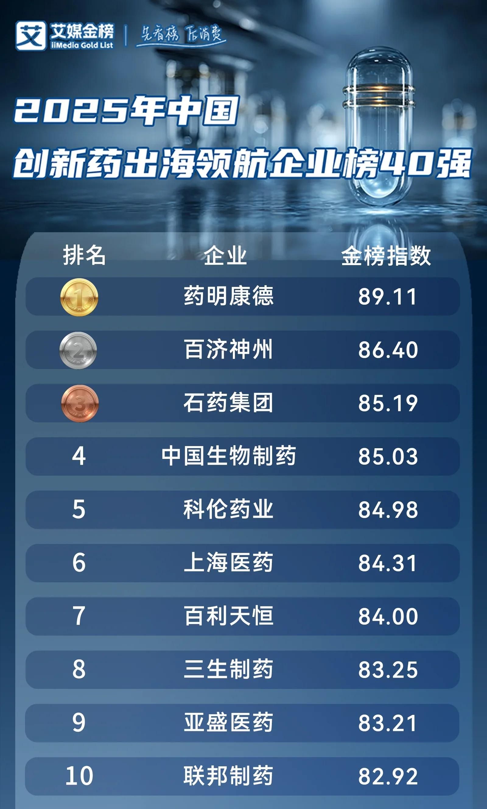 iiMedia Research(艾媒咨詢)于11月18日在新加坡2025商業(yè)與慈善論壇會上全球首發(fā)《2025年中國創(chuàng)新藥出海領航企業(yè)榜40強》,TOP10企業(yè)依次為:藥明康德、百濟神州、石藥集團、中國生物制藥、科倫藥業(yè)、上海醫(yī)藥、百利天恒、三生制藥、亞盛醫(yī)藥、聯(lián)邦制藥。其中,藥明康德以89.11的金榜指數(shù)位居榜首,百濟神州(86.40)、石藥集團(85.19)分列第二、第三。