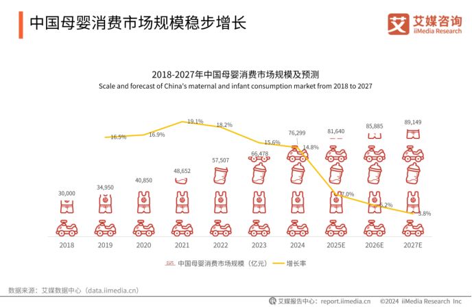近年來,中國母嬰市場歷經(jīng)多重變革:經(jīng)濟(jì)波動影響人們的消費(fèi)能力,精細(xì)化喂養(yǎng)趨勢重塑市場需求結(jié)構(gòu),95后、00后新生代父母逐漸成為消費(fèi)主力,推動代際觀念變遷,新國標(biāo)落地更直接抬高行業(yè)門檻。iiMedia Research(艾媒咨詢)數(shù)據(jù)顯示,2024年中國母嬰消費(fèi)市場規(guī)模達(dá)76299億元,預(yù)計(jì)2027年將增至89149億元,市場潛力持續(xù)釋放。