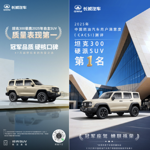 在國產(chǎn)硬派SUV的賽道中,坦克300是一款處于第一梯隊的車型。就在近日,坦克300一舉斬獲2025年自主SUV質(zhì)量表現(xiàn)第一,更蟬聯(lián)硬派SUV用戶滿意度榜首,進一步印證其硬核實力。這款收獲了47萬越野玩家青睞的明星車型,用權威認可與市場口碑,成為了眾多消費者的心儀之選。