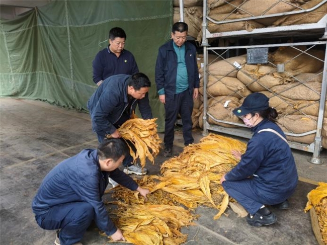 圖為:師傅們?cè)跈z查裝卸后的煙葉質(zhì)量(孔燕 攝)