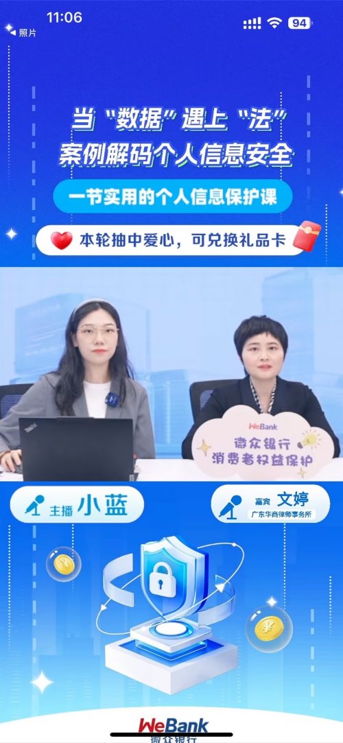 當前數(shù)字化浪潮下,個人信息已成為重要數(shù)字資產(chǎn),卻也面臨著泄露、濫用等多重風險。為切實守護金融消費者合法權益,近日,微眾銀行推出“當數(shù)據(jù)遇上法:案例解碼個人信息安全”專場直播活動。通過案例剖析與法律科普,向廣大觀眾普及個人信息的重要性及分享個人信息保護秘籍,幫助消費者提升風險防范意識,筑牢數(shù)據(jù)安全防線。
