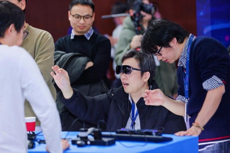 在大會現(xiàn)場,萬有引力電子科技創(chuàng)始人兼CEO王超昊博士展示了一款業(yè)界前所未有的MR眼鏡參考樣機——它搭載著“極智G-X100”芯片,重量不到100克,既有90度的虛擬場景視場角,又支持自然的手眼交互,以酷似墨鏡的形態(tài),降低用戶擁抱MR的門檻。