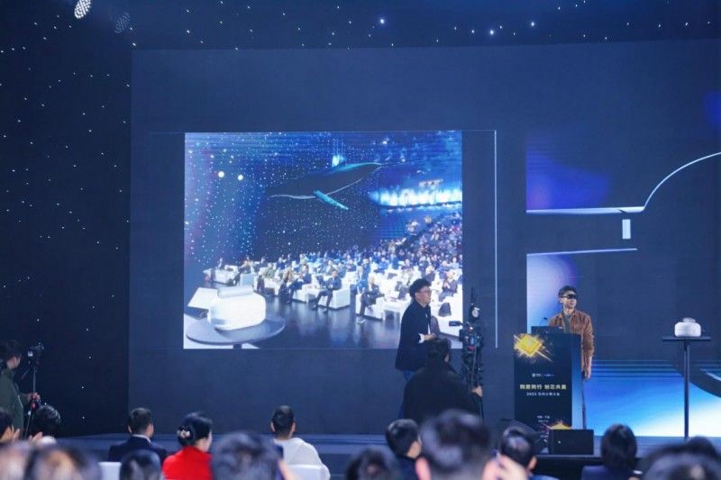 一條巨大的鯨魚“游”進了發(fā)布會現(xiàn)場,并可以跟隨手勢跟觀眾互動,引發(fā)現(xiàn)場一陣陣熱烈的掌聲和歡呼聲。這就是在“2025空間計算大會”上,由萬有引力電子科技創(chuàng)始人兼CEO王超昊博士向大家演示了通過全球首臺百克級別的MR眼鏡可以看到的場景。