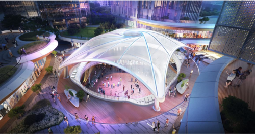 ? 「活力廣場」采用旋渦動感造型的膜結(jié)構(gòu),外圈由流線型異形金屬檐口包圍,中央區(qū)域創(chuàng)新性地運用ETFE氣枕膜構(gòu)成的雙層膜結(jié)構(gòu),并配備智能充氣系統(tǒng)。ETFE膜材透光卻不壓抑,盡管加工與安裝工藝復(fù)雜,卻極大地賦予了空間動態(tài)活力與輕盈質(zhì)感。