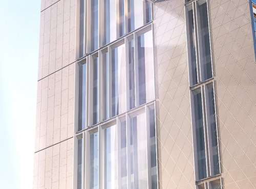 ? 山墻位選用米白色仿石蜂窩鋁板,表面經(jīng)仿石輥涂壓花處理,質(zhì)感溫潤自然。該材料系統(tǒng)不僅大幅減輕幕墻自重,有效規(guī)避了天然石材的脫落風(fēng)險,提升安全性;更以極佳的平整度、更高的材料利用率,在實現(xiàn)優(yōu)質(zhì)石材視覺效果的同時,踐行了綠色可持續(xù)發(fā)展的理念;