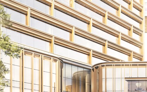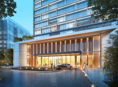 ? 裙樓立面采用不規(guī)則錯層的全明玻璃幕墻,飾以金屬色澤的氟碳噴涂鋁板,塑造出“步步登高”的現(xiàn)代建筑韻律。入口處則選用啞光石材、金屬格柵與仿木紋鋁合金,以古樸的精致細節(jié)與之呼應(yīng),展現(xiàn)出鮮明的古今交融特色。