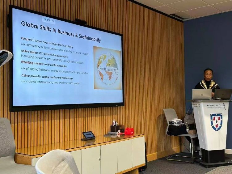 當日課程聚焦“全球化合規(guī)”與“可持續(xù)發(fā)展”兩大核心議題。上午,劍橋大學法學院Ashlee Stetser副教授以《International Law and Diplomacy(國際法與外交)》為題,結合其參與歐盟跨境貿易談判的實務經驗,解析全球化背景下企業(yè)面臨的法律風險與合規(guī)要點。其以“東南亞跨境投資稅務爭議”“歐盟進出口貿易合規(guī)稽查”等真實案例為依托,將抽象的國際法原則轉化為企業(yè)可落地的操作指引,有效降低法律知識的理解門檻。針對學員普遍關注的“跨國財會業(yè)務中的稅務合規(guī)邊界”問題,Stetser副教授逐一拆解并提供定制化合規(guī)建議。