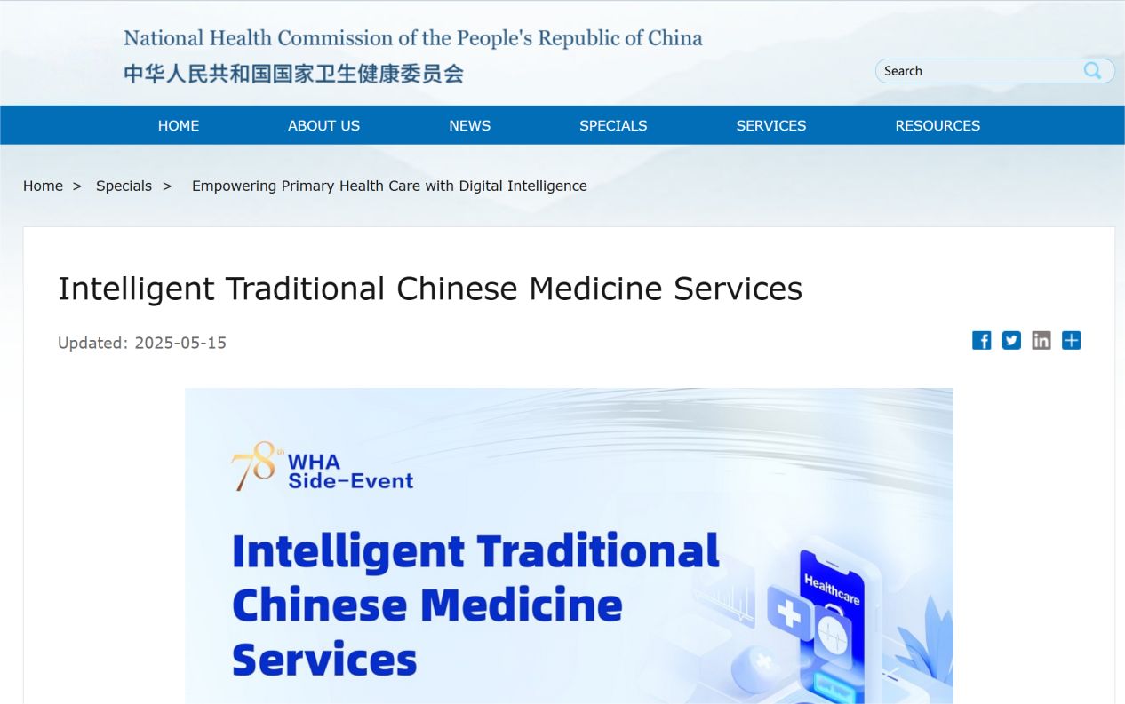 廣安門(mén)醫(yī)院“智能中醫(yī)辨證施治診療平臺(tái)”在國(guó)家衛(wèi)健委英文官網(wǎng)“世界衛(wèi)生大會(huì)‘?dāng)?shù)智賦能初級(jí)衛(wèi)生保健 促進(jìn)全民健康覆蓋’主題邊會(huì)”專題上的展示截圖