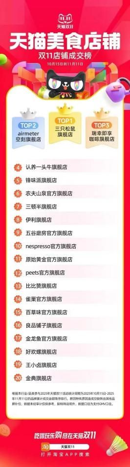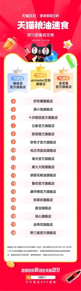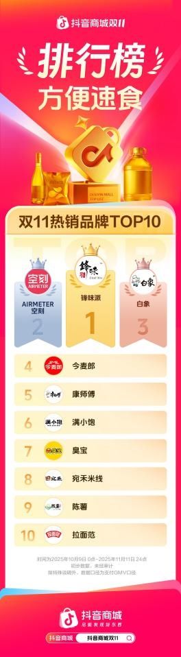 在剛落下落幕的雙十一電商大促中,西餐速食領(lǐng)軍品牌空刻再次展現(xiàn)強勁增長:全周期全平臺銷售額沖破2億元大關(guān),連續(xù)6年蟬聯(lián)天貓、抖音、京東意大利面類目TOP1!并摘得天貓糧油速食類目TOP1、抖音方便速食類目TOP2。值得一提的是,此次空刻憑借西餐速食品類身份,成功躍居天貓美食店鋪成交榜TOP2,與零食、咖啡等高復購快消品并肩而立,不僅彰顯了品類領(lǐng)先地位,更印證了品牌戰(zhàn)略布局的前瞻與高效。