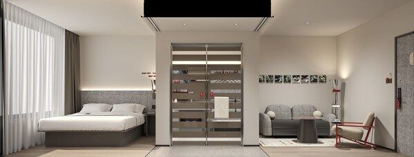 2. 靈活多變,超越期待:客廳的沙發(fā)床設(shè)計(jì)讓空間功能隨需而變。在25-30㎡的精巧空間內(nèi),通過更功能化的布局與更具設(shè)計(jì)感的氛圍,傳遞出“優(yōu)于標(biāo)準(zhǔn)間”的尊享感和性價(jià)比,實(shí)現(xiàn)以小的升級換取體驗(yàn)的躍遷。