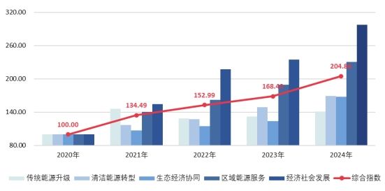 核心結(jié)果顯示,2024年指數(shù)綜合得分為204.86點(diǎn),同比增長21.65%,五年累計(jì)增長104.86%,年均復(fù)合增長率達(dá)19.64%,呈現(xiàn)“穩(wěn)步攀升、結(jié)構(gòu)優(yōu)化、質(zhì)效雙升”的總體特征,“十四五”以來能源高質(zhì)量發(fā)展目標(biāo)任務(wù)超額完成、轉(zhuǎn)型成效遠(yuǎn)超預(yù)期。內(nèi)蒙古能源經(jīng)濟(jì)逐步實(shí)現(xiàn)從規(guī)模擴(kuò)張為主轉(zhuǎn)向質(zhì)量效益優(yōu)先、從單一能源生產(chǎn)轉(zhuǎn)向多維度協(xié)同發(fā)展、從傳統(tǒng)能源依賴轉(zhuǎn)向綠色轉(zhuǎn)型引領(lǐng)的三大關(guān)鍵轉(zhuǎn)變。
