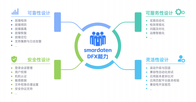 smardaten底層工程體系已完成了DFx相關(guān)工作,包含了高可用設(shè)計(jì)模式(如冗余、負(fù)載均衡)、內(nèi)置的安全最佳實(shí)踐(如數(shù)據(jù)加密、SQL注入防護(hù))、以及性能優(yōu)化技巧(如緩存策略、數(shù)據(jù)庫(kù)索引)。