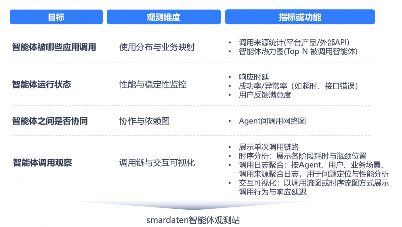 AI模型本身(如用于銷售預(yù)測(cè)的模型)也需要被管理、部署和監(jiān)控。如何確保生成的智能應(yīng)用能持續(xù)穩(wěn)定地提供智能服務(wù)?這要求AI智能體自身就是一個(gè)優(yōu)秀的“AI工程師”。 在smardaten生成包含智能模塊的應(yīng)用時(shí),模型開(kāi)發(fā)平臺(tái)能自動(dòng)完成模型的版本管理、服務(wù)封裝(如提供標(biāo)準(zhǔn)的API)、以及生成基本的監(jiān)控和日志代碼。所有智能體在運(yùn)行過(guò)程中均由Agent觀測(cè)站全程監(jiān)控,具備狀態(tài)追蹤、行為分析與運(yùn)行回溯能力,這使得生成的系統(tǒng)不僅能部署模型,還能追蹤其性能,在出現(xiàn)數(shù)據(jù)漂移或準(zhǔn)確率下降時(shí)發(fā)出預(yù)警,為后續(xù)的模型迭代提供依據(jù)。這種能力確保了系統(tǒng)中的“智能”是可持續(xù)、可運(yùn)維的。