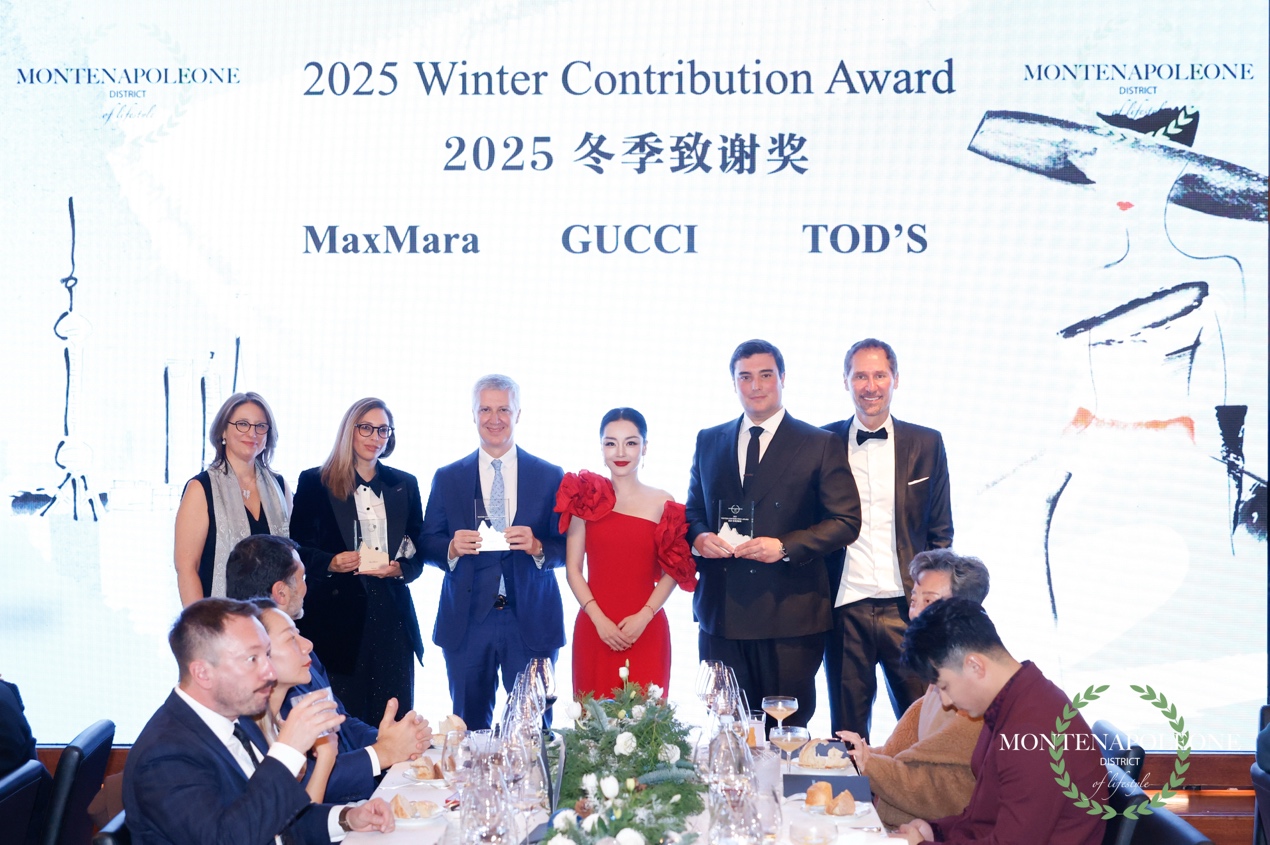 此外,當(dāng)晚同步舉行了蒙特拿破侖頒獎典禮,向在 2025 年度做出卓越貢獻(xiàn)的品牌與機構(gòu)致以特別致謝。其中,2025 冬季致謝獎授予 GUCCI、MaxMara 與 TOD’S,以表彰其在奢侈品行業(yè)中的持續(xù)創(chuàng)新與卓越表現(xiàn)。2025 文化貢獻(xiàn)獎則授予 泰發(fā)祥集團、洛克·外灘源與同策房產(chǎn),以肯定其在促進(jìn)城市文化發(fā)展、公共空間活化與跨文化交流方面所展現(xiàn)的深遠(yuǎn)影響力。