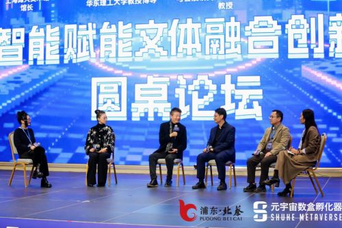 上海深湖智能科技有限公司創(chuàng)始人陳宏博,分享了《尋找周同學之時空奇遇》展的幕后技術研發(fā),這是一場潮流IP×文物×科技的跨界融合實踐 。中國傳媒大學媒體融合與傳播國家重點實驗室教授、博導唐遠清做了《AIGC時代元宇宙的發(fā)展》主題演講。接連不斷的智慧輸出,讓現(xiàn)場觀眾直呼干貨、過癮,接下來的兩場圓桌論壇,也是好戲不斷。由中國文化產(chǎn)業(yè)協(xié)會文化元宇宙專委會運營總監(jiān)梁立志主持的《人工智能賦能文體融合創(chuàng)新發(fā)展》論壇,嘉賓都是重量級,有華東理工大學教授博導王躍;華東理工大學旅游規(guī)劃與會展研究所(校級)所長,教授姚子剛;上海子圖信息技術有限公司創(chuàng)始人張亞;上海灘大美術館館長穆昉昀;絲路視覺科技股份有限公司品牌部負責人姚美凱等。