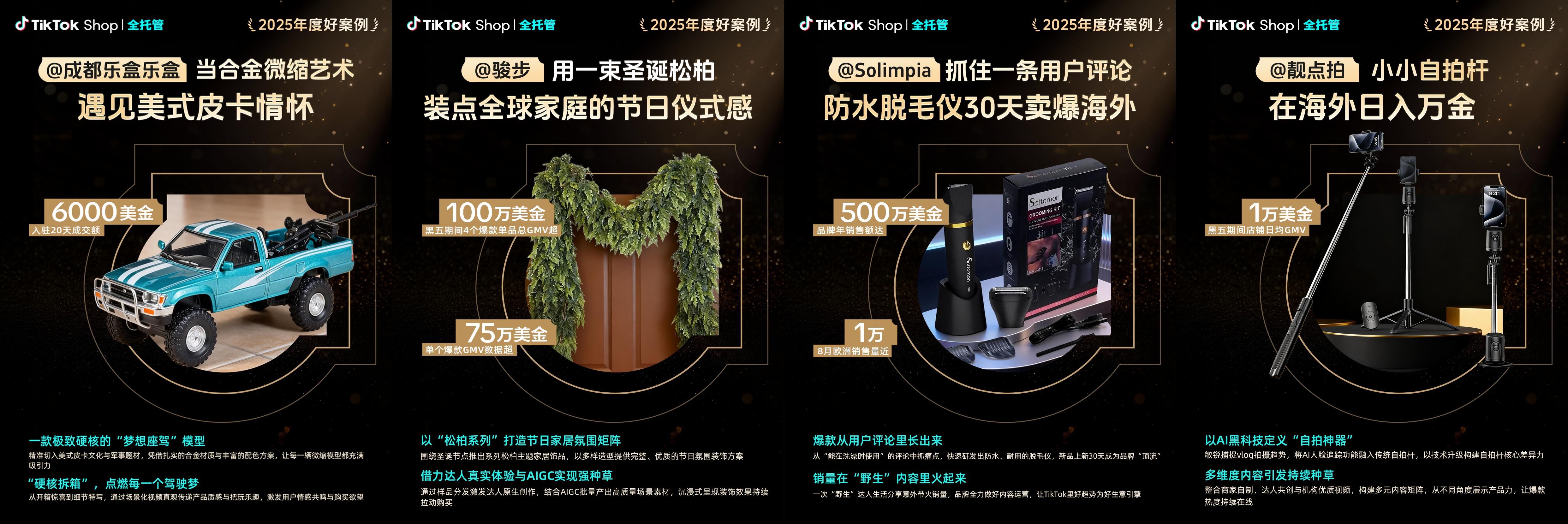 從行業(yè)觀察來看,全托管模式正在重新定義跨境出海的門檻與路徑。該模式可以助力商家實現(xiàn)“一站式好貨賣全球”,工廠型商家專注供貨省心經(jīng)營,此外可以嘗試做內(nèi)容,提升爆單幾率??梢灶A(yù)見的是,隨著TikTok Shop跨境電商不斷發(fā)展,該模式將繼續(xù)吸引大量商家加入,隨著新市場的拓展,平臺與商家在新的一年也將創(chuàng)造出更具有爆發(fā)力的生意態(tài)勢。