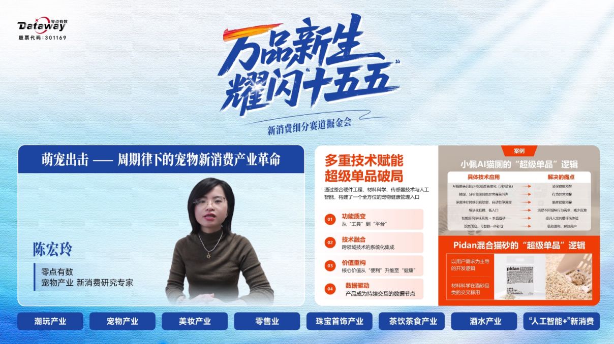 寵物產(chǎn)業(yè)新消費研究專家陳宏玲提出,寵物不應(yīng)被視為單一行業(yè),而是一個擁有1.2億只城鎮(zhèn)貓狗、規(guī)模超學(xué)齡前兒童的超級客群。她通過酒店、科技產(chǎn)品、汽車等多個行業(yè)的案例,展示了如何以“寵物家”思維改造現(xiàn)有業(yè)務(wù),實現(xiàn)創(chuàng)新增長。她詳細(xì)闡述了寵物產(chǎn)業(yè)新消費革命的三大特點:一是用新技術(shù)改造單品,如皮蛋公司通過材料創(chuàng)新提升貓砂性能;二是數(shù)字化智能驅(qū)動的小單快返供應(yīng)鏈模式,實現(xiàn)產(chǎn)品快速迭代;三是游戲化美學(xué)體驗,通過持續(xù)變臉的美學(xué)設(shè)計吸引用戶。她建議企業(yè)聚焦細(xì)分場景,建立技術(shù)雷達(dá)機制,推動敏捷創(chuàng)新,并通過數(shù)據(jù)智能實現(xiàn)AI自動化產(chǎn)品概念研發(fā)。