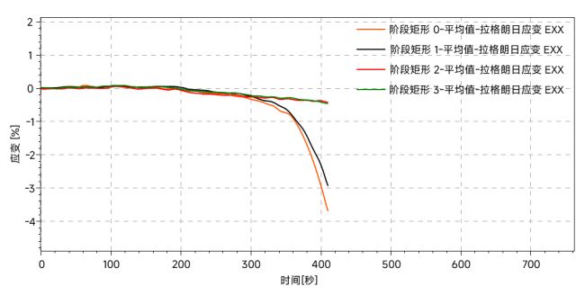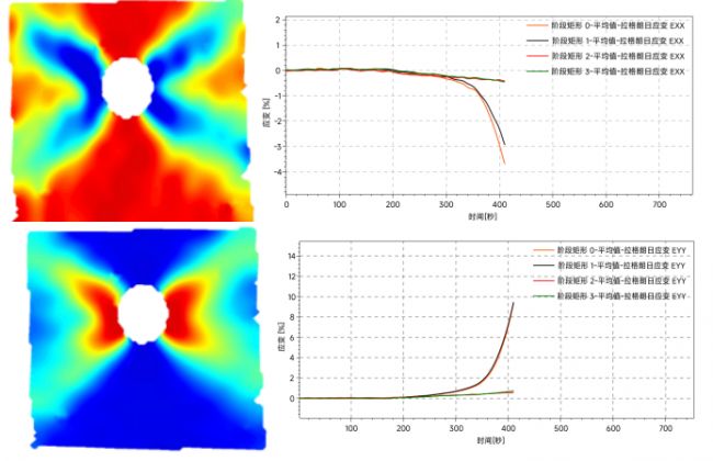 在0~300 s加載期,階段矩形0~3的X方向拉格朗日應(yīng)變Exx均表現(xiàn)為緩慢線性增長的負(fù)應(yīng)變,表明試件處于彈性-塑性變形階段,負(fù)應(yīng)變主要體現(xiàn)泊松效應(yīng),即垂直于拉伸方向的收縮。當(dāng)加載試件超過300 s后,Exx的演化出現(xiàn)明顯分區(qū)特征:左右階段矩形0、矩形1負(fù)應(yīng)變呈現(xiàn)明顯的拋物線式向下加速增長趨勢,表明材料在孔洞兩側(cè)開始進(jìn)入塑性流動階段,出現(xiàn)頸縮現(xiàn)象,導(dǎo)致泊松收縮效應(yīng)增強(qiáng);上下階段矩形2、矩形3負(fù)應(yīng)變?nèi)员3志€性增長,表明孔洞上下區(qū)域遠(yuǎn)離應(yīng)力集中區(qū),塑性變形相對較緩。