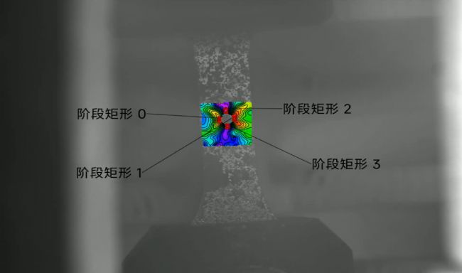 為精確捕獲試件在中心孔洞區(qū)域的應(yīng)變集中和分布情況,在孔洞周圍對稱選取4個階段矩形區(qū)域,矩形0和矩形1分別選擇在中心孔洞的左右兩側(cè),這兩個區(qū)域用于捕捉橫向收縮與孔邊應(yīng)變集中;矩形2和矩形3分別選擇中心孔洞的上下兩側(cè),這兩個區(qū)域反映了拉伸主載荷方向(Y方向)上的變形演化。