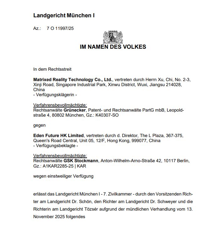 據(jù)了解,案件始于2025年9月22日。XREAL 針對(duì) Viture Inc. 及其香港運(yùn)營(yíng)實(shí)體 Eden Future HK Limited 向德國(guó)法院遞交臨時(shí)禁令請(qǐng)求,所涉專利聚焦增強(qiáng)現(xiàn)實(shí)設(shè)備及其光學(xué)系統(tǒng)這一核心技術(shù)領(lǐng)域。值得注意的是,Viture Inc.在初期并未應(yīng)訴,直至9月29日法院已單方面批準(zhǔn)針對(duì)其的禁令后,才于11月7日提交應(yīng)訴文件,并要求參與11月13日的正式庭審。德國(guó)法院經(jīng)審理后,正式認(rèn)定侵權(quán)事實(shí)成立,強(qiáng)化了禁令的法律效力。