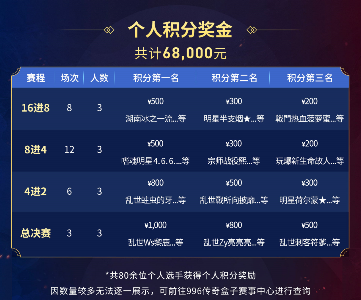 單記團隊獎金,亞軍網(wǎng)通明星隊獲得120000元,季軍嗜魂記憶獲取80000元,進入四強的一代宗師獲得50000元,進入8強完美世界獲得30000元、玩爆E族獲得25000元、盛世豪門獲得20000元、齊天大圣獲得15000元,破銅爛鐵獲得12000元、江西血色之都獲得11000元、圣裁戰(zhàn)役師獲得10000元、戰(zhàn)門皇城獲得9000元、荒天帝獲得8000元、贛超血色獲得7000元、三光獲得6000元、鐵三角獲得5000元。