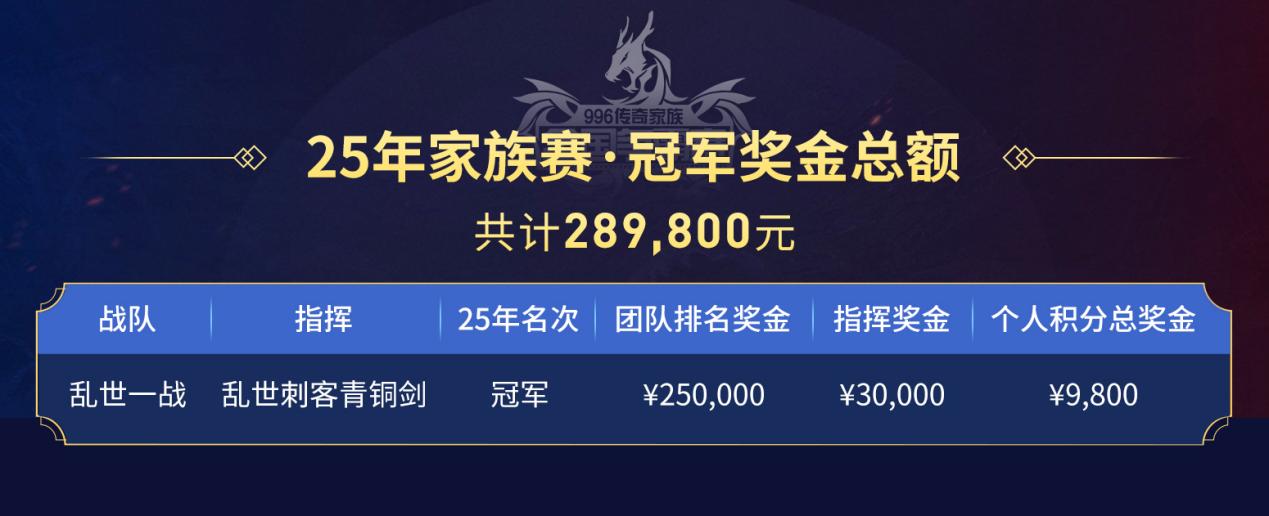 996傳奇家族全國爭霸賽在經(jīng)過13天、13場共計29輪的激烈角逐后,也已經(jīng)在12月17日圓滿落幕,入圍的16支家族隊伍幾乎都是全國范圍內(nèi)的頂尖勁旅,其中既有發(fā)展歷程近20年的老牌“世家”,也有精銳和新秀組合起來的新血團隊。最終,“亂世一戰(zhàn)”和“網(wǎng)通明星隊”兩支隊伍披荊斬棘,在總決賽上演巔峰對決,“亂世一戰(zhàn)”取得了最后的勝利,奪下冠軍獎杯,并收獲了總計289800元的獎金(團隊排名獎金250000元、指揮獎金30000元、個人積分獎金9800元)。