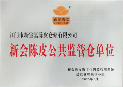 2025 年,新會區(qū)全力推進新會陳皮公共監(jiān)管倉庫創(chuàng)建工作,新寶堂陳皮倉儲有限公司憑借過硬的管理能力與突出的行業(yè)貢獻,成功獲認定為【新會陳皮公共監(jiān)管倉單位】,這既是對新寶堂倉儲實力的高度認可,更是對其推動行業(yè)標準化建設的權威肯定。