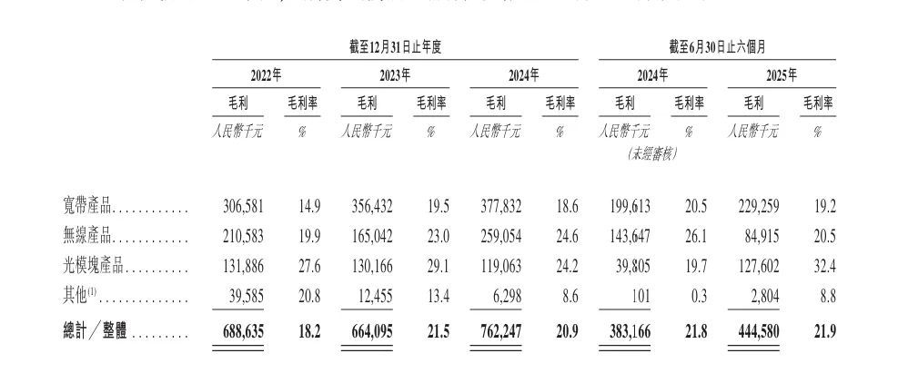 分產(chǎn)品來看,寬帶產(chǎn)品是該公司的主要收入來源,收入占比常年在54%至60%區(qū)間。另外,2025年上半年,公司光模塊產(chǎn)品的收入為3.94億元,占比提升至19.4%,而2024年的占比約13.5%。