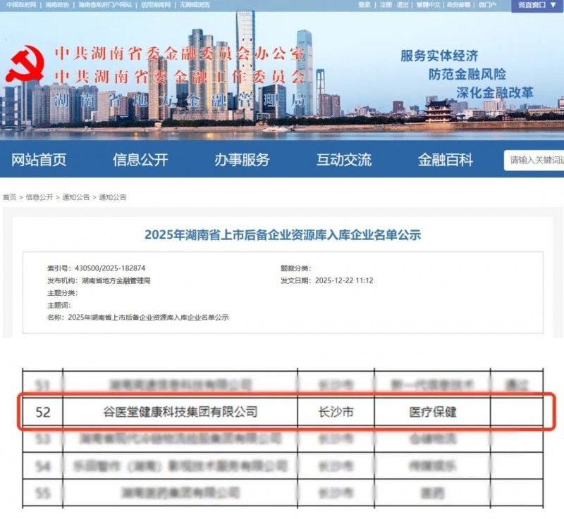 12月22日,中共湖南省委金融委員會(huì)辦公室發(fā)布《2025年湖南省上市后備企業(yè)資源庫(kù)入庫(kù)企業(yè)名單公示》,谷醫(yī)堂健康科技集團(tuán)有限公司憑借其卓越的創(chuàng)新能力和穩(wěn)健的市場(chǎng)表現(xiàn),成功入庫(kù),位列第52位。這是谷醫(yī)堂自2023年以來(lái),連續(xù)第三年入選該省級(jí)重要上市后備名單,標(biāo)志著企業(yè)在規(guī)范化發(fā)展、科技創(chuàng)新與成長(zhǎng)潛力等方面持續(xù)獲得官方高度認(rèn)可。