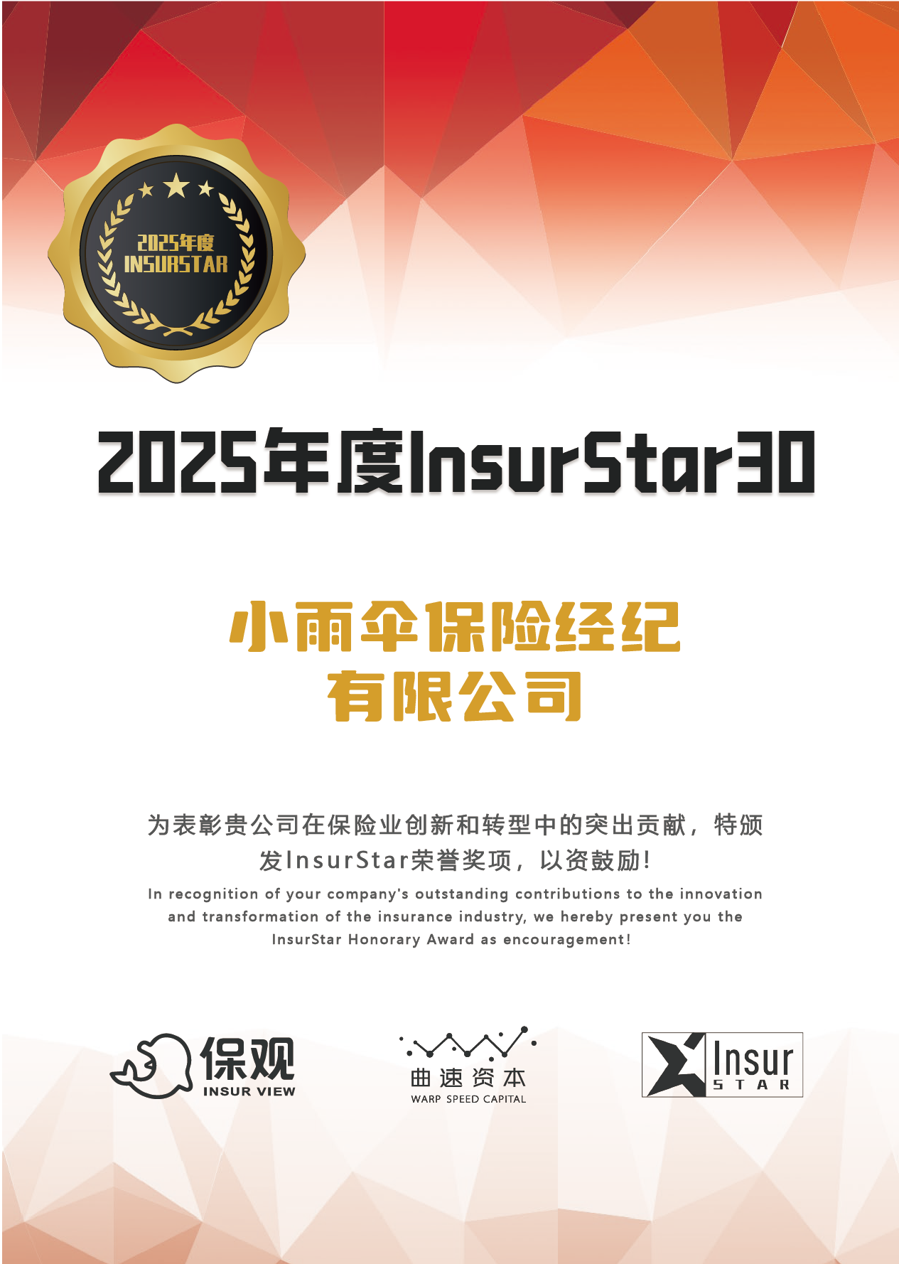 近日,備受行業(yè)矚目的2025年度保觀·InsurStar保險行業(yè)年度評選結果揭曉,手回集團旗下小雨傘保險經紀憑借在品牌影響力、產品創(chuàng)新、科技應用與服務質量等領域的卓越表現,成功入選“2025年度InsurStar30”榜單,與全行業(yè)優(yōu)秀保險公司、保險科技公司等共同躋身年度標桿陣營,這一榮譽既是行業(yè)對其綜合實力的權威認可,更是千萬用戶信賴的有力見證。