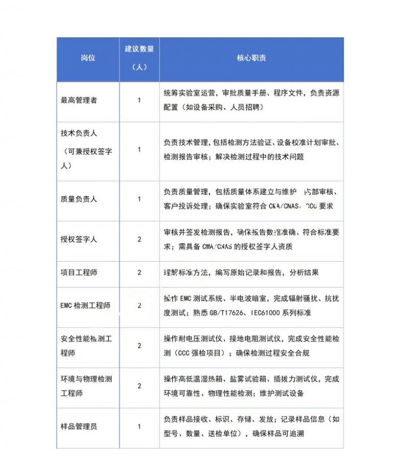 充電樁檢測實驗室(尤其是大功率超充級大功率檢測場景)對人員專業(yè)能力要求較高,需建立“技術(shù)管理+檢測操作+質(zhì)量控制”的完整人員體系,同時滿足CMA/CNAS、CCC強(qiáng)檢對人員的資質(zhì)要求。