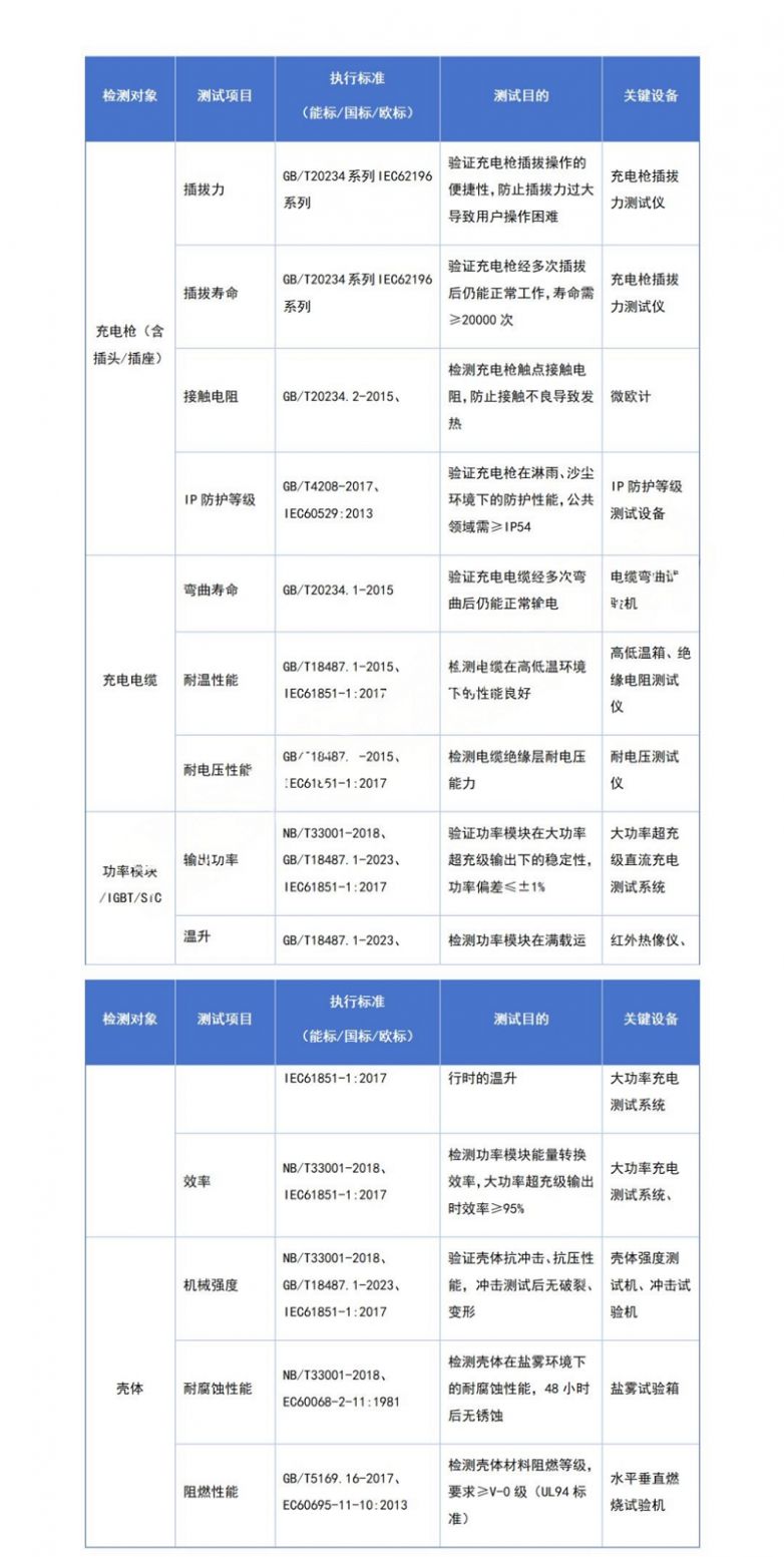 SLD技術(shù)中心基于國標(biāo)(GB/T系列)、歐標(biāo)(IEC系列)及CCC強(qiáng)檢要求,梳理大功率超充級充電樁檢測實驗室常規(guī)測試項目,涵蓋充電樁領(lǐng)域相關(guān)能力標(biāo)準(zhǔn)所對應(yīng)的『原材料及部件檢測』『充電樁整機(jī)檢測』兩大類,為實驗室檢測能力建設(shè)提供參考。