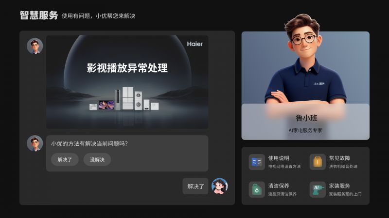 與傳統(tǒng)模式不同,海爾AI服務(wù)智能體將核心服務(wù)場(chǎng)景深度集成于電視大屏。當(dāng)用戶遇到任何產(chǎn)品使用、清潔保養(yǎng)或故障排查問(wèn)題時(shí),只需對(duì)著電視遙控器說(shuō)出問(wèn)題,即可一句話喚醒“魯小班”。智能體隨即提供文字說(shuō)明、動(dòng)態(tài)指導(dǎo)視頻等多模態(tài)解決方案,直觀易懂。