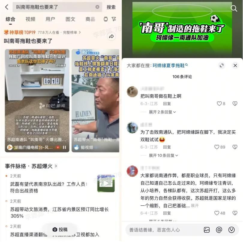 情緒是更直接的催化劑。江蘇“蘇超”聯(lián)賽期間,“叫南哥”的呼聲刷屏網(wǎng)絡(luò)。拖鞋品牌“珂締緣”迅速反應(yīng),將這句口號(hào)印上拖鞋,從設(shè)計(jì)到上架只用了極短時(shí)間。當(dāng)球迷們?cè)谥辈ラg里為勝利歡呼時(shí),這雙拖鞋就成了表達(dá)支持的最佳紀(jì)念品。一場(chǎng)由內(nèi)容熱點(diǎn)催生的消費(fèi)爆發(fā),就這樣自然發(fā)生了,小店的生意也跟著火爆起來(lái)。